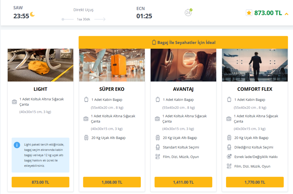 ⚠️ Dikkat edilmesi gereken şeyler: Uçak biletine dahil bagaj hakkı yoktur. İlave 150 TL daha ödeyerek, 20 kg bagaj hakkı ve 8 kg kabin bagajı ekleyebilirsiniz. Tavsiyemdir.